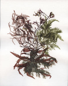 This original pressing from the salty, calm waters of the Sakonnet River near Musselbed Shoals in Portsmouth, RI, brings a little bit of the ocean into your home! Multiple specimens of marine algae are collaged into archival watercolor paper and ready for framing. This collage contains Irish Moss, Sea Fern, Chenille weed, Gracilaria, Laver and other native New England species.