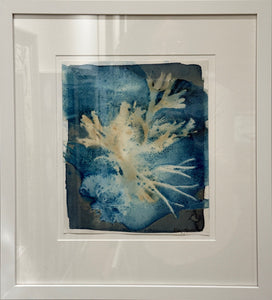 This original and unique print of seaweed from the salty waters of Narragansett Bay brings a little bit of the ocean into your home!  Multiple specimens of marine algae are placed on paper that has been coated with light-sensitive cyanotype emulsion and exposed to UV light. Additional ingredients used are soap bubbles and spices, like turmeric and sumac. This creates a fluid and ethereal setting for seaweed shapes to exist in the moment in this watery environment. Seaweed specimens used here are Irish Moss, Codium and Channel Wrack.